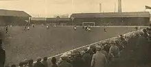 The first game after the merger took place on 23 December. Horwich R.M.I., with only ten men in their line-up, were the visitors. Blackpool won 8–0.[6] The ground, at this time, had a small wooden grandstand along the western side of the pitch, which seated about three hundred spectators. A perimeter fence ran around the rest of the pitch to keep supporters off the playing surface. Walking to the game would have been very different from today. Coming from the south, supporters would have had to navigate their way through row after row of allotments along Central Drive from Waterloo Road. All behind the west side of the ground were railway sidings and tracks. Henry Street was only partially built up, and behind the north end of the ground lay open space and the town's waste disposer and the corporation stables.[5]