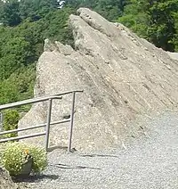 The legend of the Blowing Rock is that a Cherokee brave leapt from the rock into the wilderness below, only to have a gust of wind return him to his lover on top of the rock.[1] This is a typical example of a lover's leap legend. Blowing Rock is private property; a fee for access is payable at the adjacent souvenir shop.