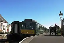 Goods traffic was withdrawn in 1963 and passenger services ceased from 4 January 1971.[1] The line from Minehead was reopened by the West Somerset Railway on 28 March 1976 and on to Williton on 28 August in the same year. Camp coaches once again grace the goods yard, where they provide overnight accommodation for volunteers working on the railway.[5]