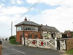 The station was first opened on 16 July 1874 by the Minehead Railway as Blue Anchor.[1] Suggestions that it was called 'Blue Anchor Excursion Platform' or 'Bradley Gate' have been shown to be incorrect.[2][3][4] In 1874 it had only one platform, which faced the beach, but in 1904 the second track and platform were built by the Great Western Railway, which had taken over the railway in 1897. At the same time the signal box was opened to control new gates on the level crossing which carries the Carhampton road across the line at the west end of the station. A goods yard was opened west of the level crossing in 1913.[5]