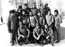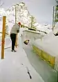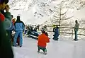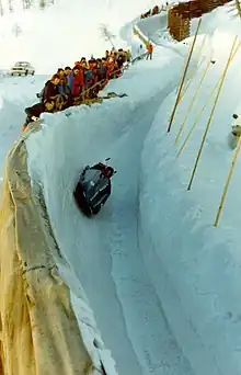 During the winter of 1962-1963 the bobsled track was given to the Cervino Company, which put it into operation with an operating expense of 11,535,021 liras. To make the natural icing of the slope, about thirty workers led by Luigi De Biaso of Voltago Agordino arrived from Agordino, who for a month accumulated a large quantity of snow, to be mixed with water and prepare the track by the plastering method, also finishing the concrete walls of the curves.[6] At least fifteen track workers were needed for the daily maintenance of the slope, for the duration of the season from December to March. The first test descent was performed by Italian champion Eugenio Monti (known as the "flying red"), who used the bobsled with which he won the 1956 Winter Olympics in Cortina d'Ampezzo: it was an immediate success, recognized by sportsmen and fans.[3]