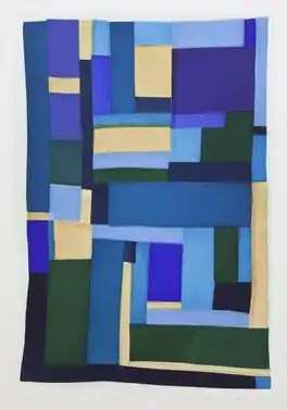 Blues is a 2007 print by Gee's Bend quilter Loretta Pettway Bennett. A quilter, Bennett begins her printmaking process by creating a sampler quilt in the style of the quilts of Gee's Bend, which uses recycled household and thrift store clothing.[1][2] Collaborating with Paulson Press (Berkley), an innovative etching technique is used to transfer the quilt to an etching plate.[1][2] The plate is coated with wax and treated with acid, which produces prints of great detail, rendering individual threads, seams, folds, and variation in color, and results in a softground spitbite aquatint etching on paper.[1][2] Blues depicts a composition of blue, green, and cream colored squares and rectangles, and measures 48.25" x 37.75", framed.
