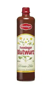 Blutwurz is a liqueur made from the root of the common tormentil plant (Potentilla erecta), which derives its German name (blood root) from the color of the juice that emerges when the root is cut. The root provided a traditional anti-inflammatory medicine. Today it is still consumed in the form of tea, syrup, cream, or powder. Most importantly, the Penninger company uses Blutwurz as the key ingredient of an herbal liqueur or Bitters that the company produces in Bavaria.