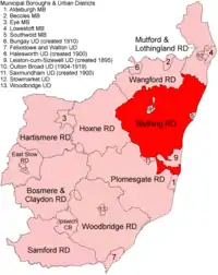 | Dunwich | 1934 | To Blyth RD (part to Southwold MB) |