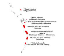 While Boa blancharensis itself is only found on Maria-Galante, the species is part of a larger series of island Boa species found across the Lesser Antilles. Today, the only surviving species are the Dominican boa and the St. Lucia boa found on Dominica and Saint Lucia, respectively. However, boas were previously more widespread across the island chain. Besides the Pleistocene fossils from Maria-Galante, Holocene remains were discovered on the island of Antigua further north, while historical records indicate that boas were present on Martinique and Saint Vincent during the 18th, 19th and 20th century. The historical reports from Martinique are additionally supported by the discovery of multiple snake vertebrae that appear to have been reworked into beads by the native human population. This, however, leaves gaps between the different island populations, notably on most of the other islands of the Guadeloupe archipelago. Only a single bone of a boa is known from the two main islands, specifically the western island of Basse-Terre. This vertebrae, which has been found at an archaeological site and was clearly reworked by human hands, may not have originated on the island itself,[1] leaving the record of the genus from the main Guadeloupe archipelago ambiguous until further discoveries are made. Another vertebrae of an indetermined species of Boa was discovered in Holocene sediments on the smaller island of La Désirade and, in this case, likely originated there, seeing as it was discovered in the den of an owl. This vertebrae may serve as an additional indicator that boas could have once been present on the main islands, as during the Pleistocene La Désirade, Basse-Terre and Grande-Terre formed a single landmass.[3]