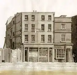 The Eastcheap Boar's Head Inn in 1829, shortly before demolition. The original Boar's Head sign is in the centre of the building, which was no longer an inn. On the ground floor are a perfume shop and a hat shop.