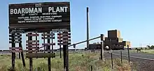The Port of Morrow, Oregon's second-largest port,[16] is adjacent to the city and located on the Columbia Riverfront. The port property also includes two (PGE) gas-fired power plants.[16] PGE also has a coal-fired power plant in the Boardman area; opened in 1980,[17] it had shut down in October, 2020 marking the closure of the last coal fired power plant in Oregon after 40 years of service.[18][19] This 550MW power plant was the largest single point of emission of greenhouse gases in Oregon.[20] The Umatilla Chemical Depot, which includes the Umatilla Chemical Agent Disposal Facility, is 10 miles (16 km) east of the city, northwest of the intersection of I-84 and Interstate 82. Seven miles east of Boardman is the Irrigon Fish Hatchery. Threemile Canyon Farms is the largest farm located In Boardman.