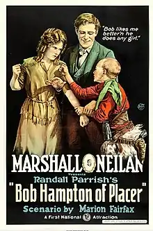 Bob Hampton of Placer is a 1921 American silent drama film directed by Marshall Neilan and written by Marion Fairfax. It is based on the 1910 novel Bob Hampton of Placer by Randall Parrish. The film stars James Kirkwood Sr., Wesley Barry, Marjorie Daw, Pat O'Malley, Noah Beery Sr., and Frank Leigh. The film was released on May 1, 1921, by Associated First National Pictures.[1][2][3][4]