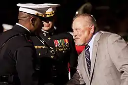 He was wounded in action, medically evacuated, and spent two months at a naval hospital recovering from his wounds. As a result of his service and injury, he earned the Combat Action Ribbon, the Vietnam Gallantry Cross, and the Purple Heart.[16]