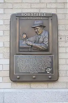 On December 12, 2011, the Hartford City Council voted unanimously to rename in Steele's honor a section of the city's Grove Street (between Prospect Street and Columbus Boulevard) in recognition of his iconic status and the 100th birthday. Bob Steele Street was officially dedicated in a special ceremony on January 4, 2013. A bronze plaque honoring Steele's career was installed on the east side of the Travelers Insurance building at the intersection of Bob Steele and Prospect streets on May 19, 2015. The plaque, created by sculptor Michael Keropian,[3] was unveiled in a ceremony on May 29, 2015.
