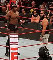 On the April 9, 2018, episode of Raw, the night after WrestleMania 34, Lashley made his return to WWE after a ten-year absence, becoming a member of the Raw brand once again, where he confronted and attacked Elias with a chair.[84] The first month of Lashley's return saw him in a number of tag-team matches, teaming with the likes of Braun Strowman, Bobby Roode, Finn Bálor, Seth Rollins, and Roman Reigns, all being in victorious efforts against the likes of Kevin Owens, Sami Zayn, Jinder Mahal, The Miz, Curtis Axel, and Bo Dallas.[85][86][87] Lashley later teamed with Braun Strowman at Backlash on May 6 in a victorious effort against Kevin Owens and Sami Zayn.[88] Following Backlash, Lashley entered into a feud with Sami Zayn, culminating with Lashley facing Zayn in a victorious effort at Money in the Bank on June 17.[89] Lashley then entered a feud with Roman Reigns, where both men believed that they were the rightful challenger to the Universal Championship.[90] This led to a match between the two at Extreme Rules on July 15, where Lashley defeated Reigns.[91] The following night on Raw, two triple threat matches were set to determine who would face Universal Champion Brock Lesnar at SummerSlam on August 19, with Lashley and Reigns won their respective matches, setting up a number one contender's match between the two the following week,[92] which Reigns won.[93]