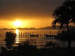 The Five Islands (left), Carrera Island (middle), and the Point Gourde Peninsula at sunset. The view is looking southwest from Trinidad.