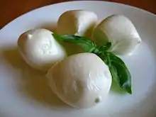 Bocconcini (Italian: [bokkonˈtʃiːni]; SG: bocconcino, Italian: [bokkonˈtʃiːno], 'small mouthful') are small mozzarella cheese balls. Like other mozzarellas, they are semi-soft, white, and rindless unripened mild cheeses that originated in Naples and were once made only from the milk of Italian Mediterranean Buffalo. Nowadays, they are usually made from a combination of buffalo and cow's milk. Bocconcini are packaged in whey or water, have a spongy texture, and absorb flavors.