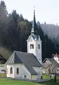 The local church is dedicated to Saint Peter. It dates to the early 16th century, although the nave was vaulted in the Baroque style at a later date. The nave contains remains of frescos from the early 16th century. The sanctuary is also decorated with saints in the lower borders, apostles at window height, and evangelists and angels higher up, all by the painter Jernej of Loka dating to between 1525 and 1540.[11] The church altars date to the 18th century.[4][12]