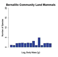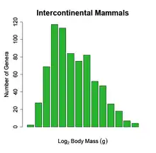 The body size-species richness pattern (see fig. 1) has been documented for land mammals across numerous continents such as North America, South America, Eurasia and Africa (Brown and Maurer, 1989;[5] Bakker and Kelt, 2000;[6] Maurer et al. 1992[7]). Traditionally the pattern has been explored by plotting the number of species on the y-axis and the logarithm to the base two of the species body mass (g) on the x-axis. This yields a highly right skewed body size distribution with a mode centered near species with a mass ranging from 50-100 grams. Although this relationship is very distinct at large spatial scales, the pattern breaks down when the sampling area is small (Hutchinson and MacArthur, 1959;[1] Brown and Maurer 1989;[5] Brown and Nicoletto 1991;[3] Bakker and Kelt 2000[6]).