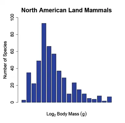 Figure 1. The Frequency distribution of North American land mammals (n=465). The figure shows a right skewed distribution, with a mode tending to smaller species (50–100 g). The x-axis encompasses mammals ranging in size from 3 grams to 393 kilograms. Redrawn from Brown and Nicoletto (1991)[3]