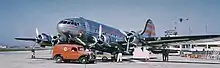 Passenger facilities were reduced to 4 bunks which when folded away allowed seating for 12, along with 4 seats along the opposite side of the aircraft.[41] Removable tables were provided in the cabin to lay out maps and do paperwork.[42] The exterior was then camouflaged in standard USAAF colours, with olive drab upper surfaces and neutral grey undersides,[10][45] and each aircraft had its name painted on the nose and over the cabin door, which would also be used by many later operators.[45] The names had previously been used in TWA publicity, but not painted on the aircraft.[8]