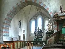 Internally, the church is decorated with two sets of medieval murals dating from the construction period and the mid-15th century, respectively. The later ones are in the style of the so-called Master of the Passion of Christ. Most of the furnishings date from the 18th century, with the exception of the baptismal font (13th century) and a large, medieval iron chandelier. Some medieval tombstones are also visible in the choir.[1]