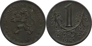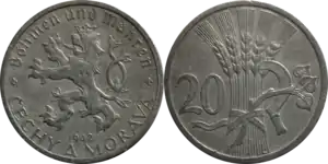 In 1940, zinc 10, 20 and 50 haléřů coins were introduced, followed by 1 koruna in 1941. The coins were minted until 1944.[1] The reverse designs were very similar to the earlier Czechoslovak coins. The coins were emergency issue types, similar to the coins of other German-occupied territories.[2]