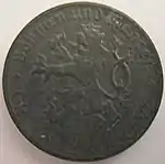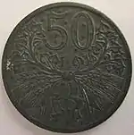 | 50 haléřů | 53,270,000 (1940)[6] | ![]() ![]() | Mass: 3.7 Diameter: 22 Edge: Milled Composition: 100% Zinc Obverse design: Czech lion Lettering: Böhmen und Mahren ČECHY A MORAVA 1940 Reverse design: Denomination with linden branches and wheat ears below Lettering: 50 |