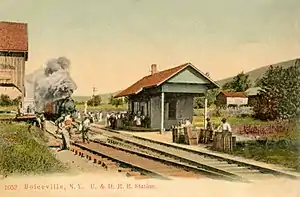 Boiceville Railroad Station was built by the Ulster and Delaware Railroad to serve the community of Boiceville, New York. Located at MP 21.3, Boiceville was the westernmost depot to be removed as a result of the construction of the Ashokan Reservoir. Although the community of Boiceville was submerged, the station site remains above the reservoir level, at a point just west of where the old railroad right of way slips under the waters of the reservoir, and just east of where it diverges from the new line.[2]