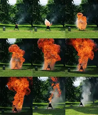 A slopover occurs when water is poured onto the fuel while a pool fire is occurring. If the fire is small enough, the water that instantly boils in contact with the fire or with the lower layers of blazing liquid (which are themselves not on fire but may be hotter than the water boiling point) can extend the flames, especially in the upwards direction.[2][3] Such slopovers are common at the domestic scale, for example in cooking fires. If the size of the fire is more important, such as in industrial-scale tank fires, there is no noticeable effect when water is doused on the fire. (However, water sinking to the bottom of the tank may contribute to a later boilover).