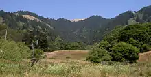 The ridge parallels a section of the San Andreas Fault, and features panoramic vistas with trees, meadows, rounded hillsides, Bolinas Lagoon, Tomales Bay, the Olema Valley and the Pacific Ocean.[3] The base of the ridge at the south end includes the community of Stinson Beach, with the ridge rising abruptly from around 400 feet (120 m) to over 1,900 feet (580 m) at the highest point.[4] West Ridgecrest Road, a two lane highway, runs along the southern portion of the ridge, and has been the location for numerous automobile commercial video shoots.[5] This roadway begins at the Rock Spring parking area and heads north along the ridge. Views to the east include lakes and undulating hills, with the ocean to the west, the source of dense fog that sometimes obscures all views and limits visibility to a few feet.[6][7]