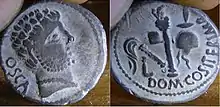Bolskan is famous for its ancient mint, and its abundant coins include an issue that includes an unidentified bearded male facing right on the obverse and a horseman carrying a spear and the name of the city in an Iberian inscription on the reverse.[2] The coins of Bolskan changed in 37 BC, when the city was refounded as Osca. They now include dthe Latin inscriptions OSCA on the obverse and DOM. COS. ITER. IMP on the reverse, which were Denari in denomination.[3] The coins of both Bolskan and Osca are found within the Iberian coin collections of the British Museum [4]