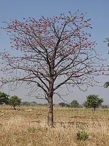 Bombax costatum is a tree usually reaching a height of 5 – 15 m. It flowers in the dry season before the leaves appear.