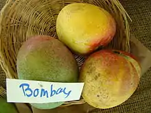 Bombay was originally grown from a seed brought to Jamaica from India during the Indian indenture system in the 19th century.[1] The fruit became popular due to its widely accepted flavor, and Bombay was eventually introduced into the United States via south Florida, where it is now sold as nursery stock. A 2005 pedigree analysis of the Florida mango cultivars found that Bombay was a parent of several mangoes which originated in the state, including Bailey's Marvel, Jacquelin, and Zill.[2] All were estimated to have been Haden x Bombay crosses.