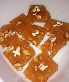 Karachi halwa is a popular South Asian sweet.[1][2] It is made of corn flour, water, clarified butter or ghee and sugar. Karachi halwa is usually coloured orange, red or green and flavoured with cardamom and ghee. It has a long shelf life.[3]