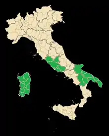 In the year 2000 there were 1,170 hectares (2,890 acres) of Bombino nero planted throughout Italy, most of it in the southern Italian wine region of Apulia. Here it is a permitted grape variety in the DOC wines of Castel del Monte in the province of Barletta-Andria-Trani and the Lizzano DOC in the Taranto province. Other vineyards of the grape can also be found in Basilicata, Lazio, and on the island of Sardinia.[1]