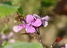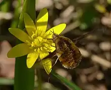 The B. major bee-fly is a common, generalist floral pollinator, meaning that it does not give preference to one flower over another, instead pollinating a wide variety of plant families and species.[2][13] The fly uses its proboscis to carry and transfer the pollen. The species is a dominant pollinator within its community, sometimes even pollinating up to two thirds of the local flowers. In addition, B. major will visit and pollinate plants that attract few other species. Some types of flowers, for example Pulmonaria officinalis, will be almost exclusively pollinated by B. major, with other species contributing a negligible amount to that plants pollination. Some flower species, such as Delphinium tricorne, are even specifically adapted to the fly in terms of color, shape, and form. If given the choice, B. major will have a consistency in plant choice.[13]