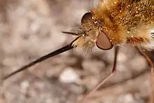 The adult body size varies from 6.3 to 12 mm in length and is considered a relatively medium-sized fly. The body color is dark, but is densely covered by a thick coat of lighter color hairs.[2][6] The head is typically brown and black hairs, but the lower portion of the head is mostly white hairs. It has dark patches on the anterior half of the wings and long hairy legs that dangle while in flight.[7] The dark wing span can range from 8.4 to 14 mm and has a dark brown edge.[6] Their boldly patterned wings have a distinct dividing border through the horizontal middle between the dark and clear portions. Their antennae are typically very short and pointed.[7] Additionally, the species has long legs and a long rigid proboscis found in the front of the head, which is used to feed on the nectar of flowers.[6] The proboscis ranges from 5.5 to 7.5 mm in length.[2] While its wings continue to beat, its front legs grip the flower and its long rigid beak is inserted to collect the nectar.[8] Despite its fearsome appearance, the beak is quite harmless.[8] Males are typically smaller than females.[2] Movement is categorized by both hovering and darting between locations.[9] The flies also emit a high-pitched buzz.[7]