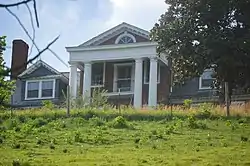 has 1 ½ story flanking wings with dormers. The house is over a raised basement. Jeffersonian influence is seen