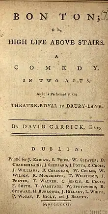 Bon Ton; or, High Life Above Stairs is a comedy act in two acts by David Garrick, first performed at the Theatre Royal, Drury Lane on 18 March 1775. According to Garrick's introductory notice to the play, it had been written many years before.[1] The play stars James William Dodd as Lord Minikin, Thomas King as Sir John Trotley, William Brereton as Colonel Tivy, Phillip Lamash as Jessamy, William Parsons as Davy, William Burton as Mignon, Elizabeth Pope as Lady Minikin, Frances Abington as Miss Lucretia Tittup, and S.J. Platt as Gymp.