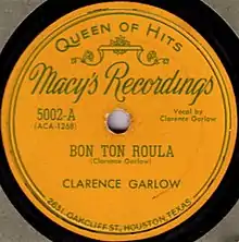 In 1949, Garlow recorded "Bon Ton Roula", using a different arrangement and lyrics. The song was recorded as a sixteen-bar blues[6] with "an insistent, swirling rhumba rhythm".[4] Singer and music writer Billy Vera commented on the song's lyrics: "The song featured some of the same kind of broken Cajun-isms as Hank Williams's 'Jambalaya'":[7]