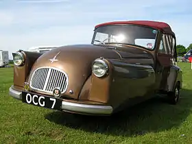 By the time of the Earl's Court Cycle and Motor Cycle Show in November 1951, three pre-production Mark C's were on show.[43] On these the front wings had become longer and less triangular in profile than the ESC, the grille was also lower and more rounded and the front valance was now a more defined bumper shape.[44] The new Minicar design was very well received,[45] and was due to go on sale in early 1952.[46] By July however, "owing to supply difficulties" it was still unavailable,[47] and the earliest production cars were not recorded as being built until October 1952.[48] Four of the cars were on display at that year's show along with a Sharp's Minivan.[49]