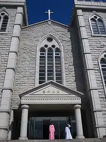 It is one of just a handful churches in the country and one of only two Protestant churches, the other one being Chilgol Church.[2] Bongsu Church was originally constructed in 1988 and was the first church built in the country during communist rule. The church was relocated to a larger building in around 2008 and now offers seats for up to 1,200 people. Service at the church has been observed by visiting foreigners but it is debated whether the attendees present consisted of "genuine Christians".