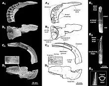 Bonitasaura also shows that some lines of titanosaurian evolution converged with diplodocids, namely low long skulls without the characteristic nasal arches of other macronarians (such as Brachiosaurus or Camarasaurus) and lower jaws that were squared off and contained comb-like teeth (as in Rebbachisauridae), reversed limb proportions (the front limbs shorter than the hind limbs, unlike the condition in most other macronarians) and rudimentary whiplash tails. It also made the suggestion that the titanosaur Antarctosaurus is a chimera made up of a titanosaurian skull and body and a diplodocoid jaw, as proposed by some authors (McIntosh 1990; Jacobs et al. 1993; Upchurch 1999) less likely.[3][4][1][5]