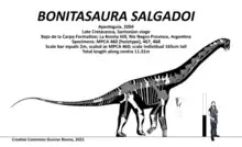 Bonitasaura is a titanosaurian dinosaur hailing from uppermost layers of the Late Cretaceous (Santonian) Bajo de la Carpa Formation, Neuquén Group of the eastern Neuquén Basin, located in Río Negro Province, Northwestern Patagonia, Argentina. The remains, consisting of a partial sub-adult skeleton jumbled in a small area of fluvial sandstone, including lower jaw with teeth, partial vertebrae series and limb bones, were described by Sebastian Apesteguía in 2004.[1]