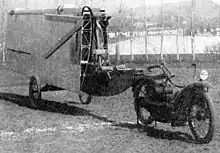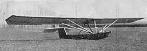 The fuselage was a triangular cross-section, plywood covered box beam, inclined upwards to place the triangular tailplane at the same height as the wing, strut braced on top of a trapezoidal fin. The fin carried a deep, unbalanced rudder, rectangular except at the bottom where it was cropped to match the bottom line of the beam. It worked in a notch between the two otherwise rectangular elevators, also unbalanced. The completely exposed pilot's seat was on the upper surface of the forward end of the beam, just under the leading edge, where a narrower forward extension carried the rudder bar and, on its underside, the front end of a landing skid that reached below and behind the pilot.[1]
