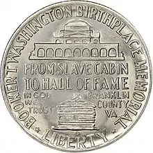 The Booker T. Washington Memorial half dollar was designed by Isaac Scott Hathaway and minted in silver between 1946 and 1951. The obverse depicts Booker T. Washington. The reverse shows the cabin in which Washington was born, now the Booker T. Washington National Monument, and the Hall of Fame for Great Americans, in which Washington is honored. The description on the reverse reads "From slave cabin to Hall of Fame."[1]