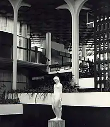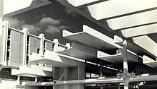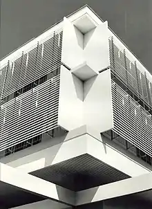 Following the aesthetics of the International Style, in 1958 he designed his first notable work, the Museum of the Liberation in Sarajevo, now the Historical Museum of Bosnia and Herzegovina, with E. Šmidihen and R. Horvat. The design received the National Award "Viktor Kovačić" in 1963. The design is an abstract composition of simple, clean forms. The solid, protruding cubic volume of the upper floor appears to float above the transparent glass and metal supporting structure. On the 8th of November 2012, the building was officially declared a National Monument of Bosnia and Herzegovina.[8] In 2018 the Getty Foundation awarded a grant for the conservation of the building as part of its "Keeping it Modern" initiative.[9]