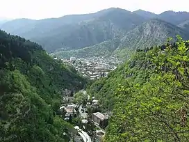 Borjomi Gorge (Georgian: ბორჯომის ხეობა) is a picturesque canyon of the Kura River in central Georgia. The gorge was formed as a result of the Kura River cutting its path through the Lesser Caucasus Mountains where the Trialeti and Meskheti Ranges meet. A significant portion of the Borjomi Gorge is covered by mixed and coniferous forests made up of oak, maple, beech, spruce, fir, and pine. A large portion of the Borjomi-Kharagauli National Park lies within the gorge, as well as the towns of Likani and Borjomi itself.[1] Baku–Tbilisi–Ceyhan pipeline cuts through the portion of the gorge.[2]