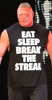 On the December 30 episode of Raw, Lesnar returned with Heyman to challenge the winner of the upcoming WWE World Heavyweight Championship match between Randy Orton and John Cena at the Royal Rumble.[107] Lesnar then dared any wrestler who disapproved of that notion to challenge him, which was answered by Mark Henry. The ensuing brawl ended with Lesnar delivering an F-5 to Henry.[108] The following week on Raw, Henry challenged Lesnar again, only to have Lesnar dislocate his elbow with the Kimura lock in storyline, which led Big Show to confront Lesnar,[109] thus starting a feud which was settled at the Royal Rumble on January 26, 2014, where Lesnar defeated Big Show after attacking him with a steel chair before the match began.[110] On the February 24 episode of Raw, Heyman stated that Lesnar had requested a match for the WWE World Heavyweight Championship at WrestleMania XXX, but received an open contract to face anyone else of his choosing instead. The Undertaker then returned and attacked Lesnar with a chokeslam through a table, setting up their match at WrestleMania XXX.[111] At WrestleMania on April 6, Lesnar defeated Undertaker after executing three F-5s, ending his undefeated WrestleMania streak at 21, a feat that was described by Sports Illustrated as being "the most shocking result since the Montreal Screwjob".[112]