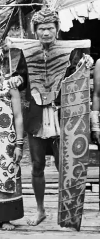 Natives of Borneo keep the memory of the tiger alive in their culture by treating its body parts as heirlooms; therefore, it has been suggested that the Bornean tiger survived longer than prehistoric times.[6] Tiger claws were used as protective amulets among the Kenyah, Ngaju and Iban peoples, possibly for important ceremonies or to be worn by individuals of prominent status; vocabulary referring to the animal's presence (but also in avoidance speech) is also attested, such as aso for 'dog' or buang / bohang for 'bear', as a replacement in Kayanic languages.[14] Tiger motifs are also seen depicted in traditional, ceremonial and modern carvings; additionally, tigers can be seen on weaved fabrics, such as mats and clothing, like the Iban pua kumbu.[14]
