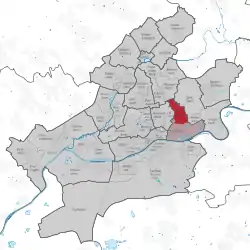 Location of Bornheim (red) and the Ortsbezirk Bornheim/Ostend (light red) within Frankfurt am Main | |