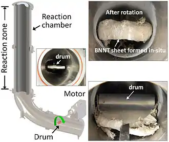 All well-established techniques of carbon nanotube growth, such as arc-discharge,[3][14] laser ablation[15][16] and chemical vapor deposition,[17] are used for mass-production of BN nanotubes at a tens of grams scale.[13] BN nanotubes can also be produced by ball milling of amorphous boron, mixed with a catalyst (iron powder), under NH3 atmosphere. Subsequent annealing at ~1100 °C in nitrogen flow transforms most of the product into BN.[18][19] A high-temperature high-pressure method is also suitable for BN nanotube synthesis.[20]