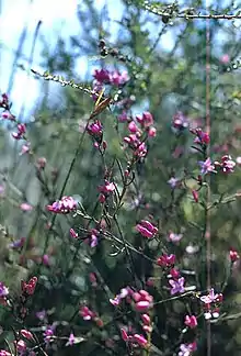 Boronia nematophylla is a shrub that grows to a height of 0.5–2 m (2–7 ft) and has slender, glabrous branches. The leaves are sessile, slender, more or less cylindrical and 10–30 mm (0.4–1 in) long. The flowers are pale red to purple and arranged singly or in small groups in leaf axils on a pedicel about 4 mm (0.2 in) long and that is thicker near the flower. The four sepals are egg-shaped or more or less round and 1.5–2 mm (0.06–0.08 in) long. The four petals are about 8 mm (0.3 in) long and glabrous. The eight stamens are woolly hairy. Flowering from June to November.[2]